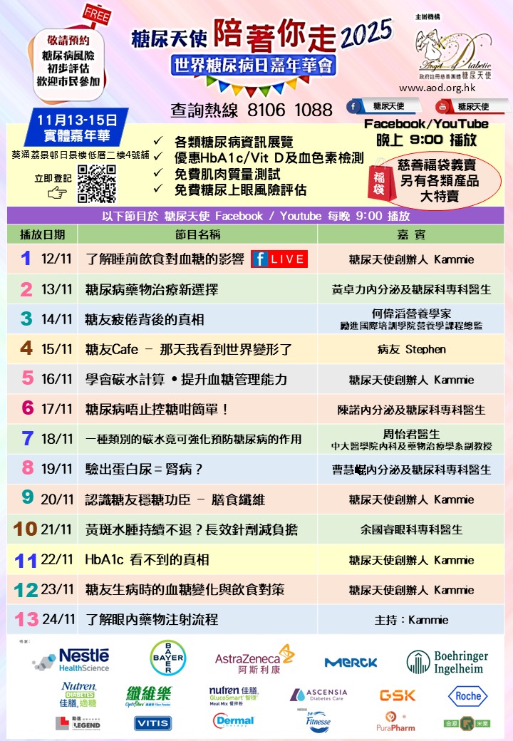 11月14日係一年一度世界糖尿病日,今年糖尿天使由11月12日(星期二)開始為大家帶來精彩嘅活動節目,千其唔好錯過啦~