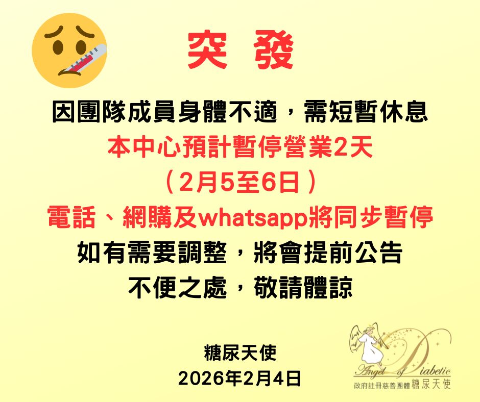 因團隊成員身體不適,需短暫休息,本中心預計暫停營業 2 天(2月5至6日)。