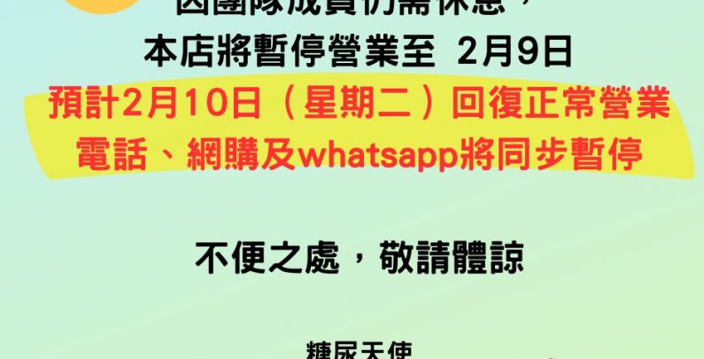 062 月 開放通告 2 月 6, 2026 因團隊成員仍需休息, 本店將暫停營業至 2月9日 預計2月10日(星期二)回復正常營業 電話、網購及whatsapp將同步暫停 不便之處,敬請體諒 糖尿天使 2026年2月6日 閱讀更多