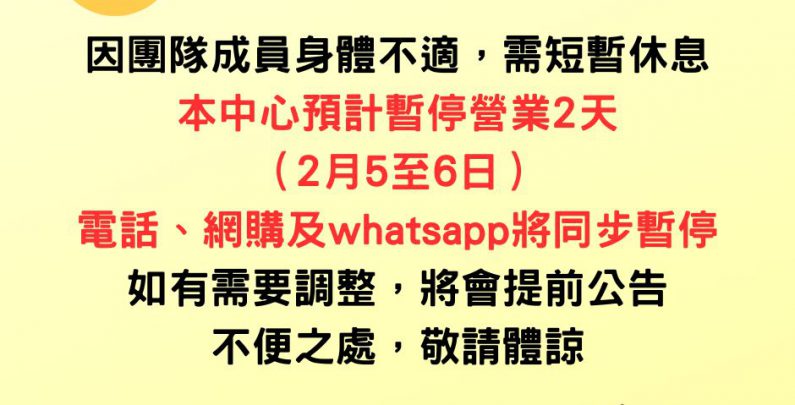 042 月 開放通告 2 月 4, 2026 📣突發‼️ 因團隊成員身體不適,需短暫休息,本中心預計暫停營業 2 天(2月5至6日)。 電話、網購及whatsapp將同步暫停。 如有需要調整,將會提前公告。 不便之處,敬請體諒 糖尿天使 2026年2月4日 閱讀更多